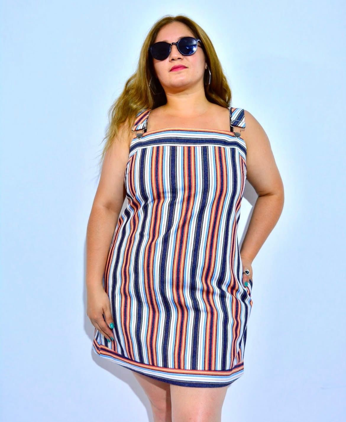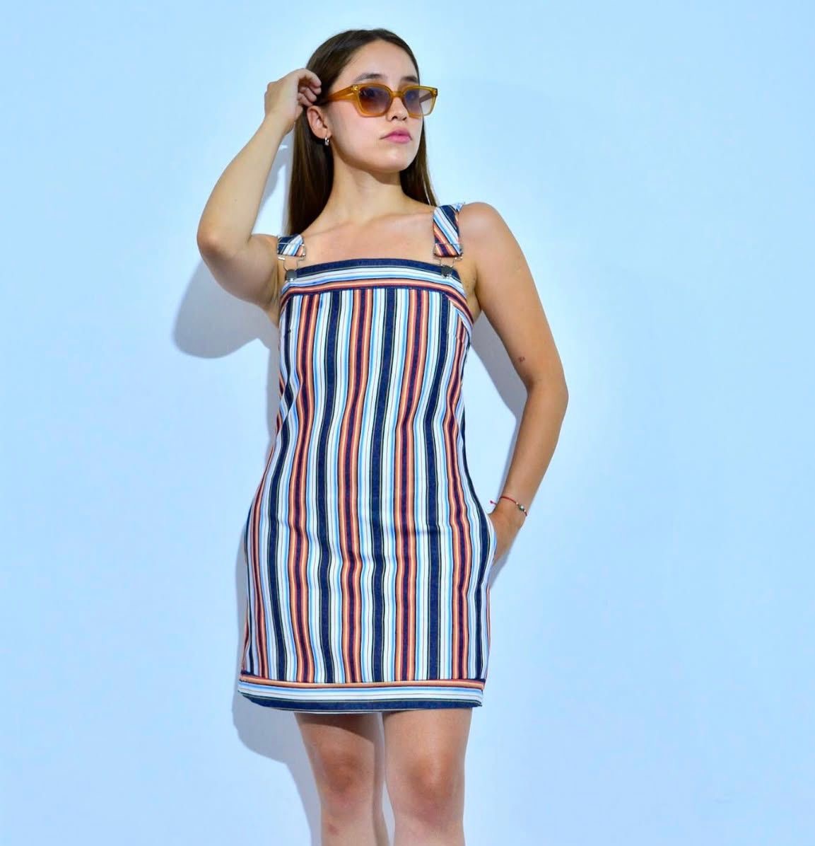 Vestido jardinera Zoe de denim de rayas, con calce cómodo, tirantes ajustables y bolsillos laterales. Un infaltable urbano para el día a día.